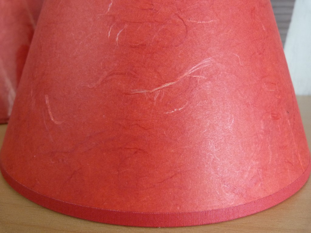 Abat jour neuf (vendu à l'unité) en papier à fibres rouge, forme conique. Bel effet à la lumière, cela fait ressortir les fibres du papier.
