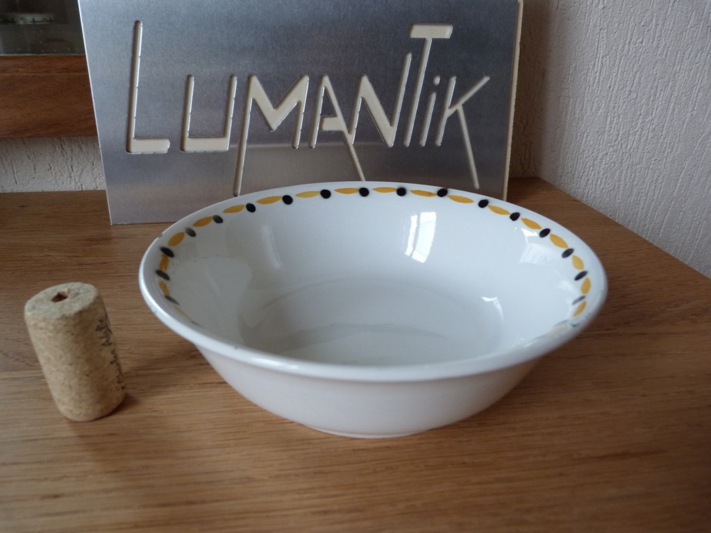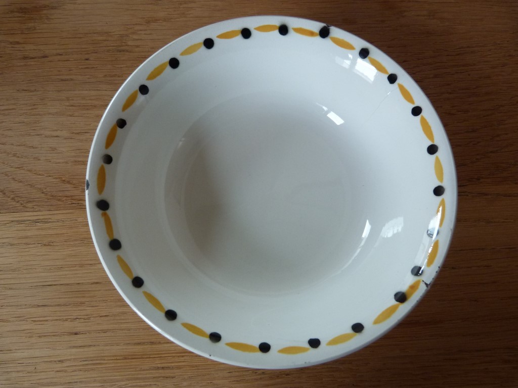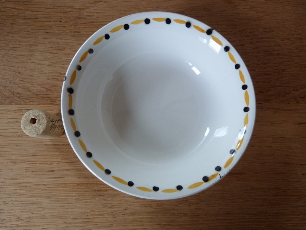 En excellent état, belle brillance, à noter une craquelure sur le bord lors de la cuisson (cela fait comme une fèle, mais pourtant ne semble pas en être une), et des petits manques de céramique sur le pourtour (sans gravité).
