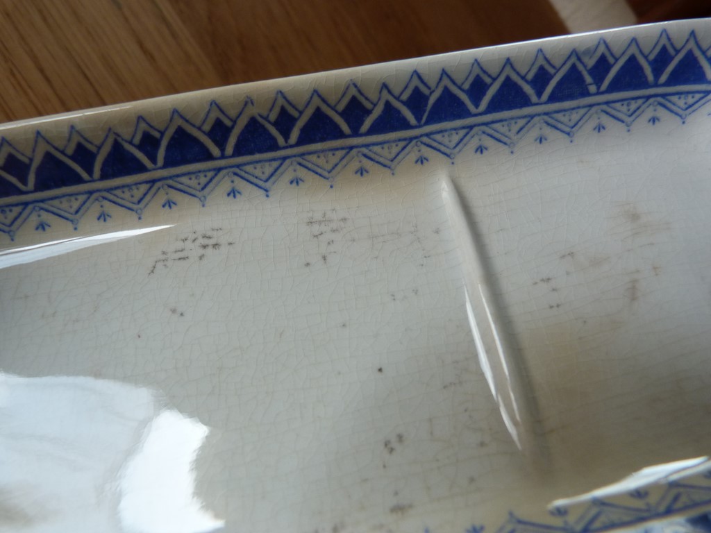Bon état, à signaler des petites tâches jaune sur le fond et sur les cotés, ainsi que des petits points noirs, pas contre il n'y a pas de fêles, ni d'éclats.