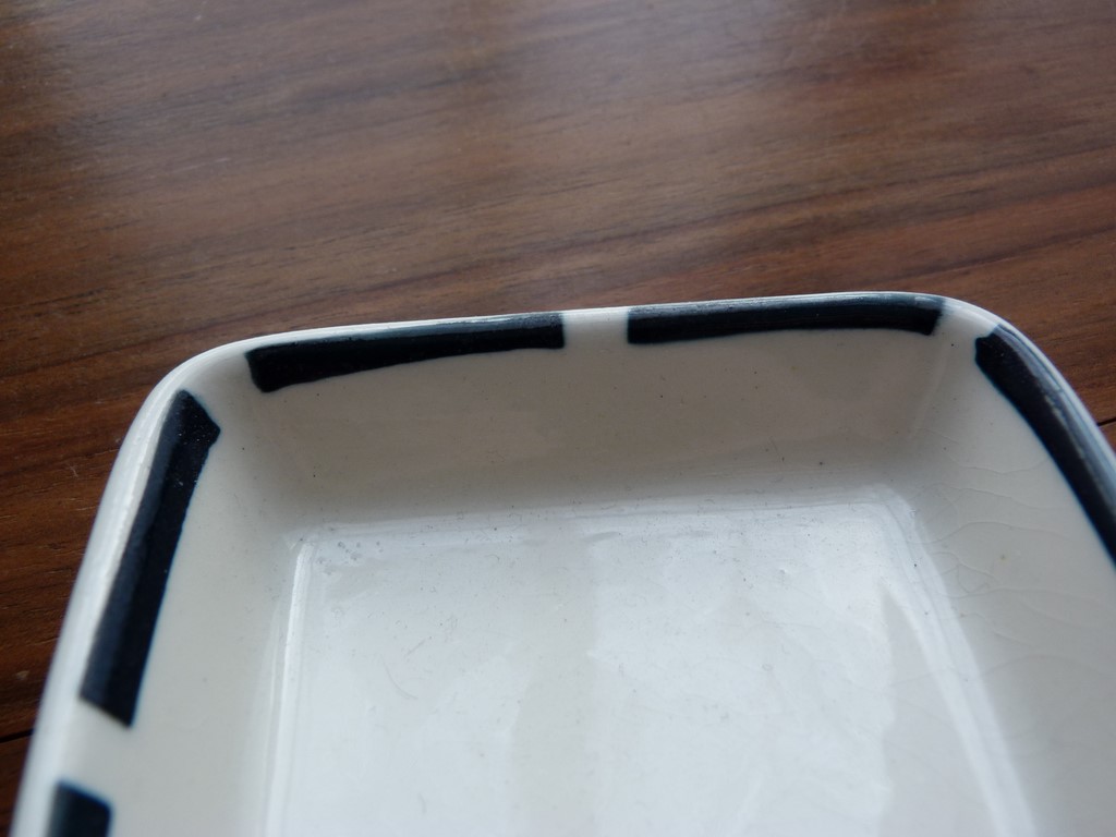 Couleur : fond blanc, avec une frise de rectangle vert foncé (sur les photos on dirait du noir, mais c'est bien du vert très foncé)