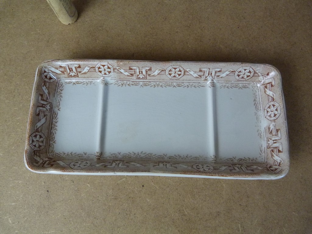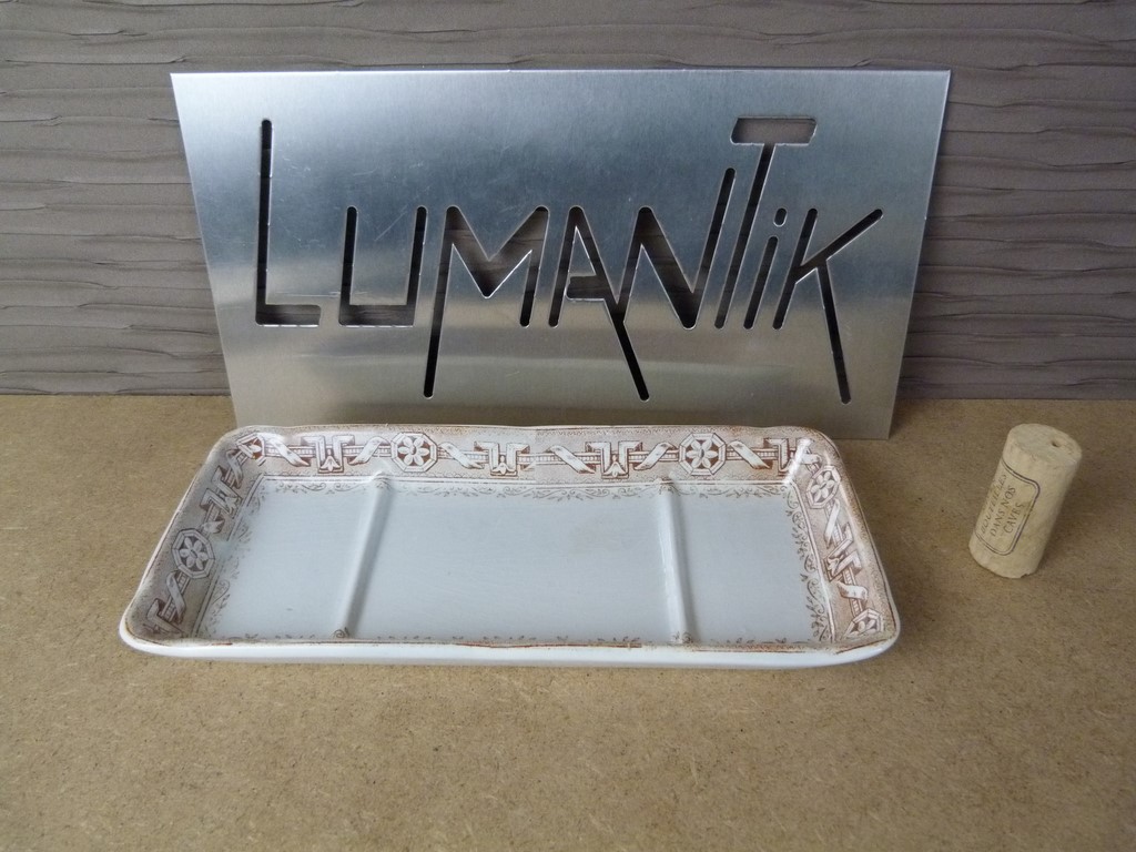 Couleur : blanc avec un décor marron clair représentant des rubans et des encadrés de fleur