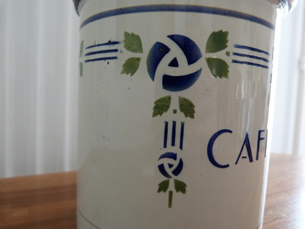 Un ancien pot à café en tôle émaillée (début XXème, époque art déco - 1920-1930). A poser sur une étagère dans une cuisine, idéal pour une jolie décoration vintage.