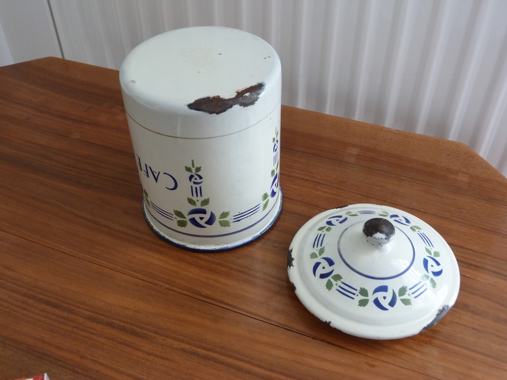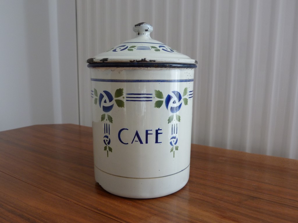 Ancien pot à épices Café en tôle émaillée typique art déco - 1920