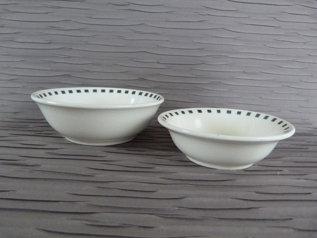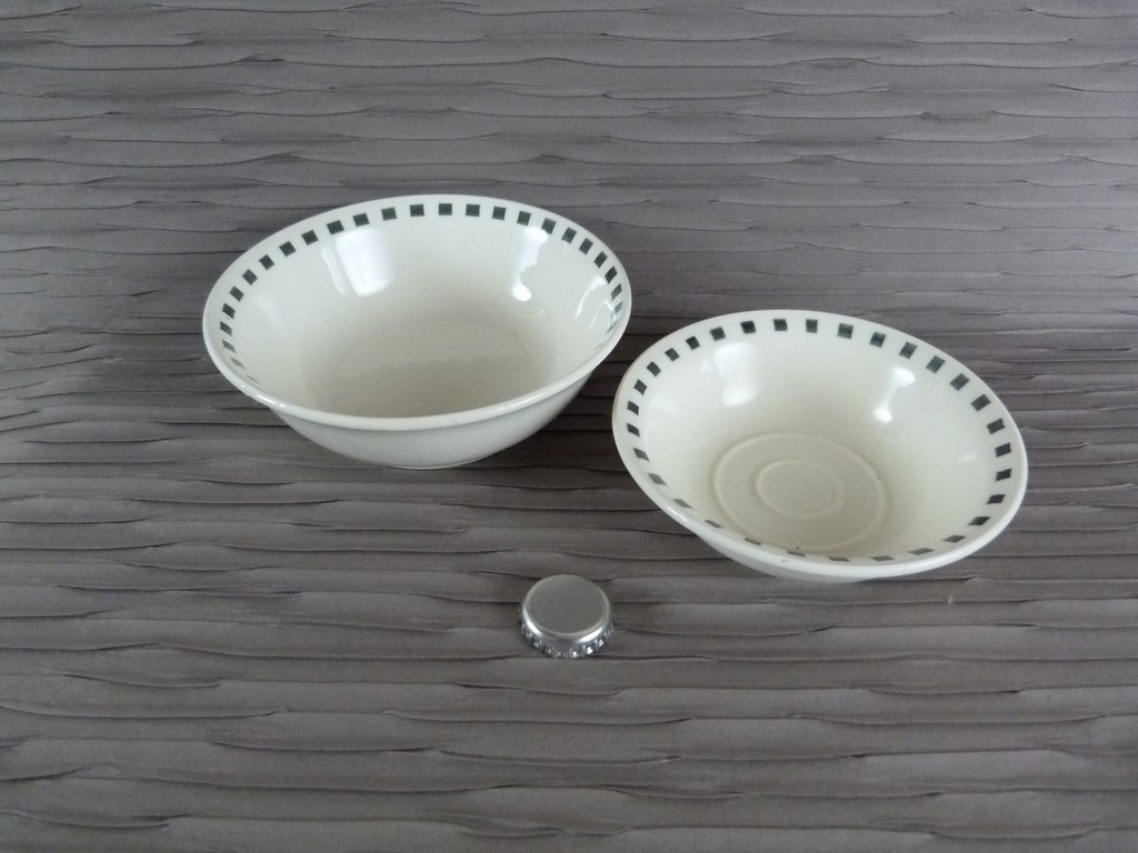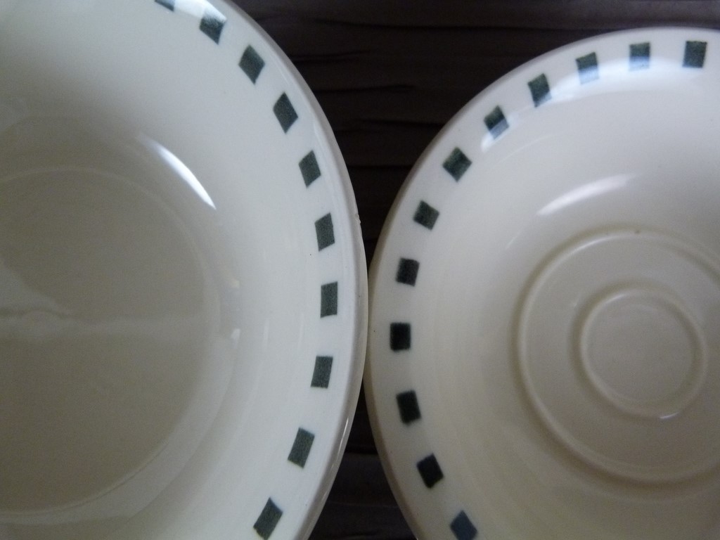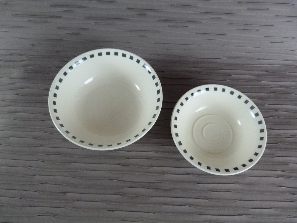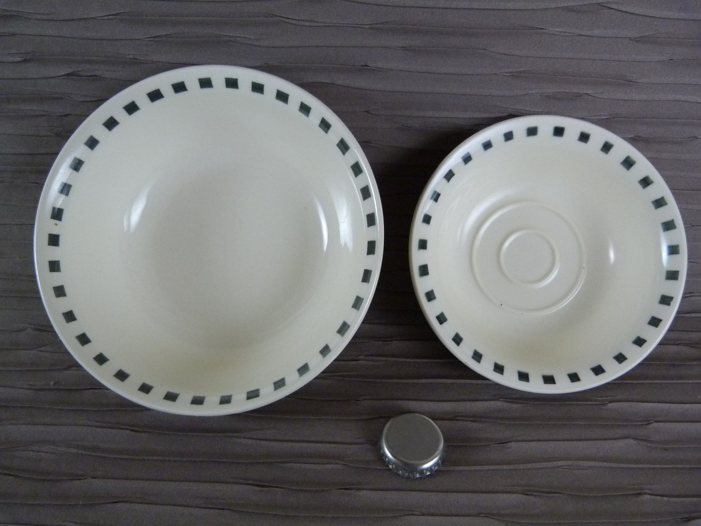 Couleur : du fond blanc-crême, bordé d' une frise de carré de couleur gris anthracite ou noir assez pâle.