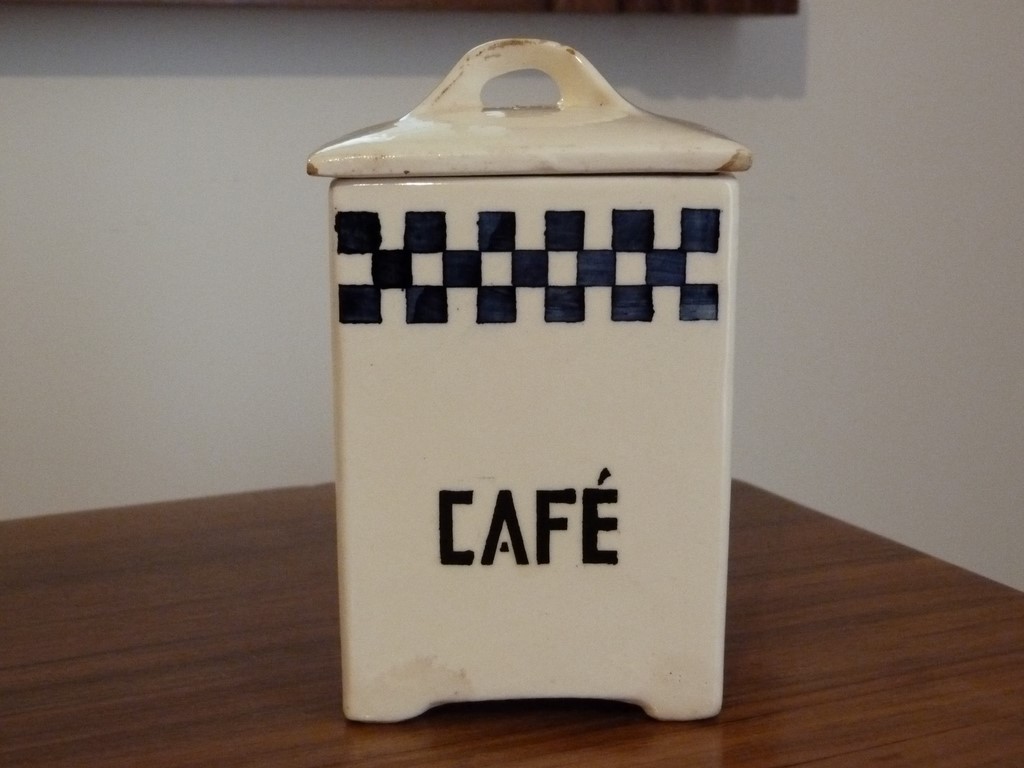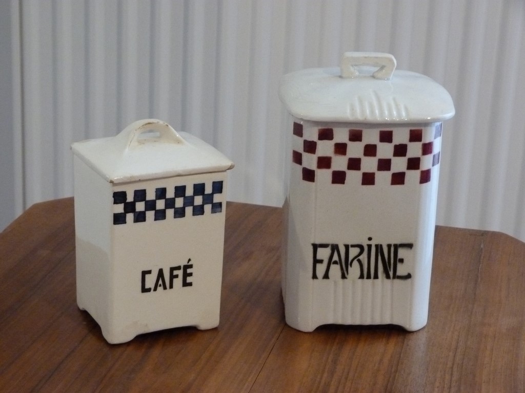 Un joli lot composé de 2 pots à épices en faïence, décor à damier (bordeaux pour le grand pot Farine et bleu pour le pot Café), dans le style lustucru.
