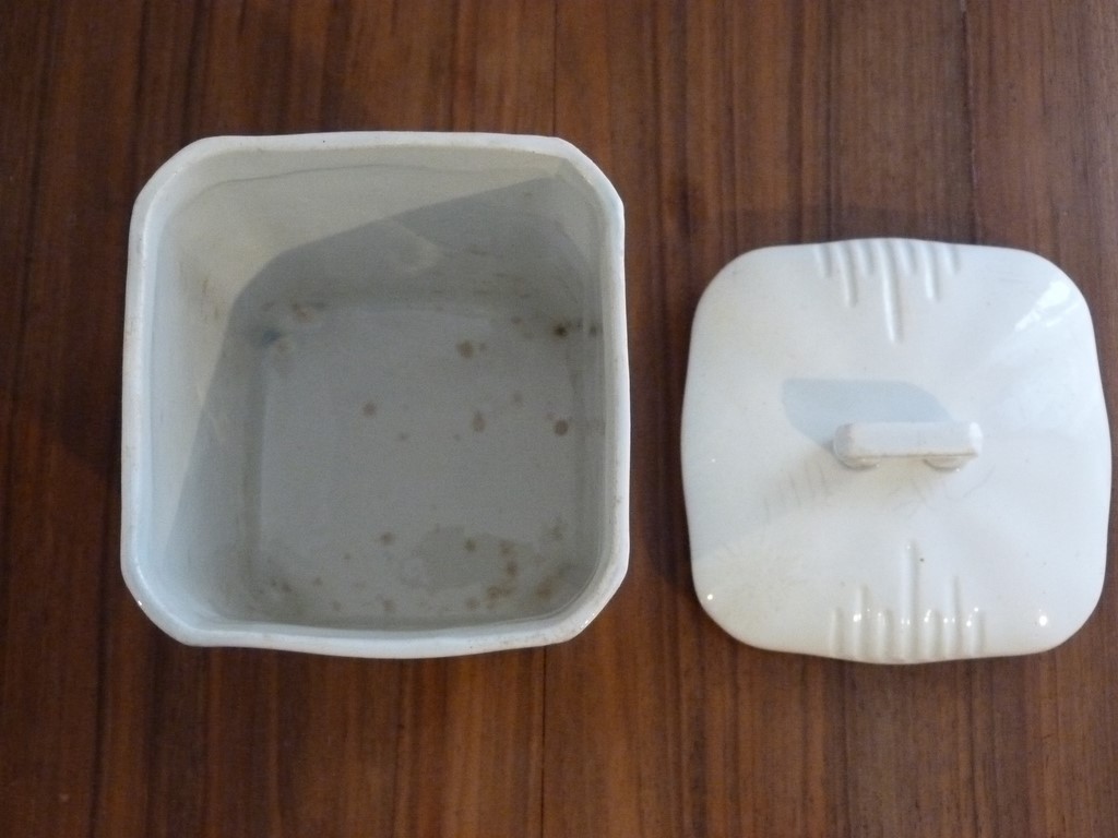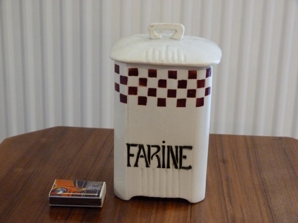 Pot à Farine bordeaux : marque en creux N°5 dessous, pas de fêle, des anciens petits points (toutes petites tâches) à l'intérieur sans gravité (pas d'odeur d'humidité). Couvercle en très bon état malgré un micro éclat en bordure (très petit) et un ancien éclat très bien recollé sur l'intérieur du couvercle, ne se voit pas. L'intérieur du pot reste blanc et brillant comme le montre les photos. Dimensions : hauteur totale avec couvercle : 18 cm - pot 9,6 x 10 cm