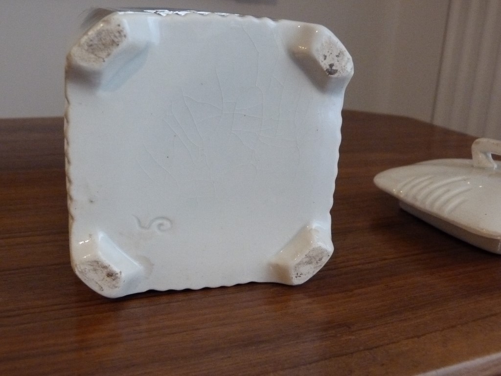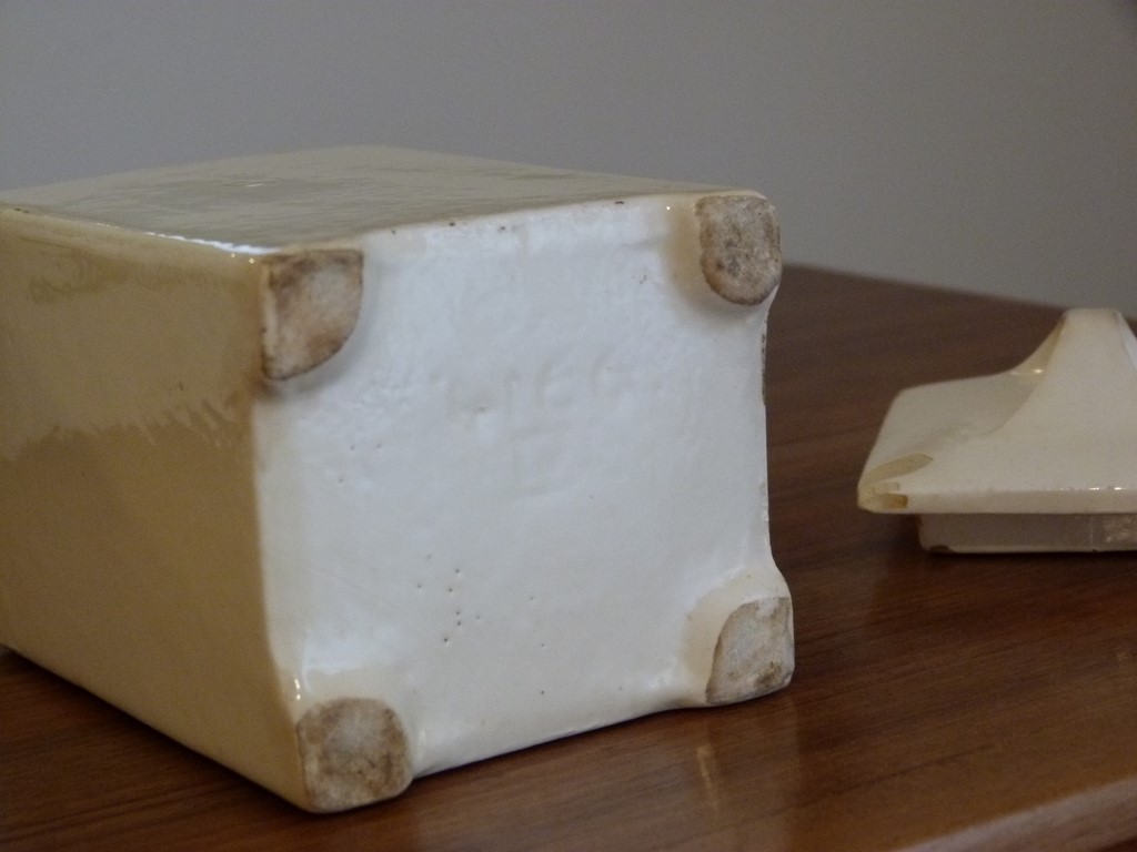Pot à Café bleu : marque en creux peu lisible N° 9917 (je crois), pas de fêle, l'intérieur est bien blanc, brillant et sans odeur d'humidité, Il est à noter des petits points (sans gravité, peu nombreux). Sur l'extérieur des petites tâches au bout des pieds peu visibles (voir les photos). Le couvercle a différents petits éclats de surface sur chaque coin. Dimensions : hauteur totale avec couvercle : 13,5 cm - pot 7,3 x 8 cm