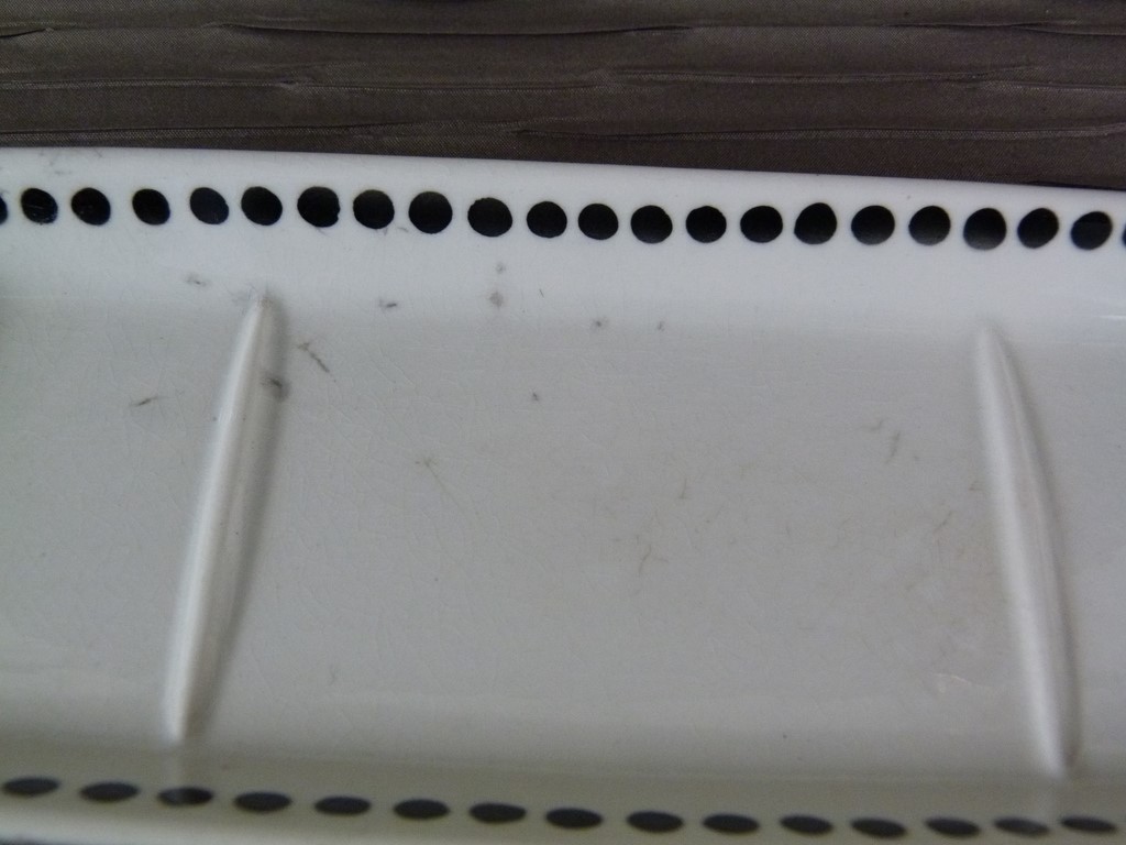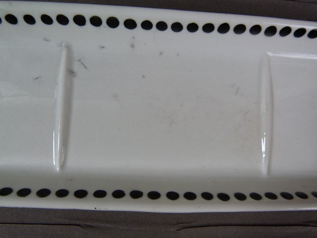 Pas de tampon au dos. Couleur : blanc-crême avec une frise de points noirs
