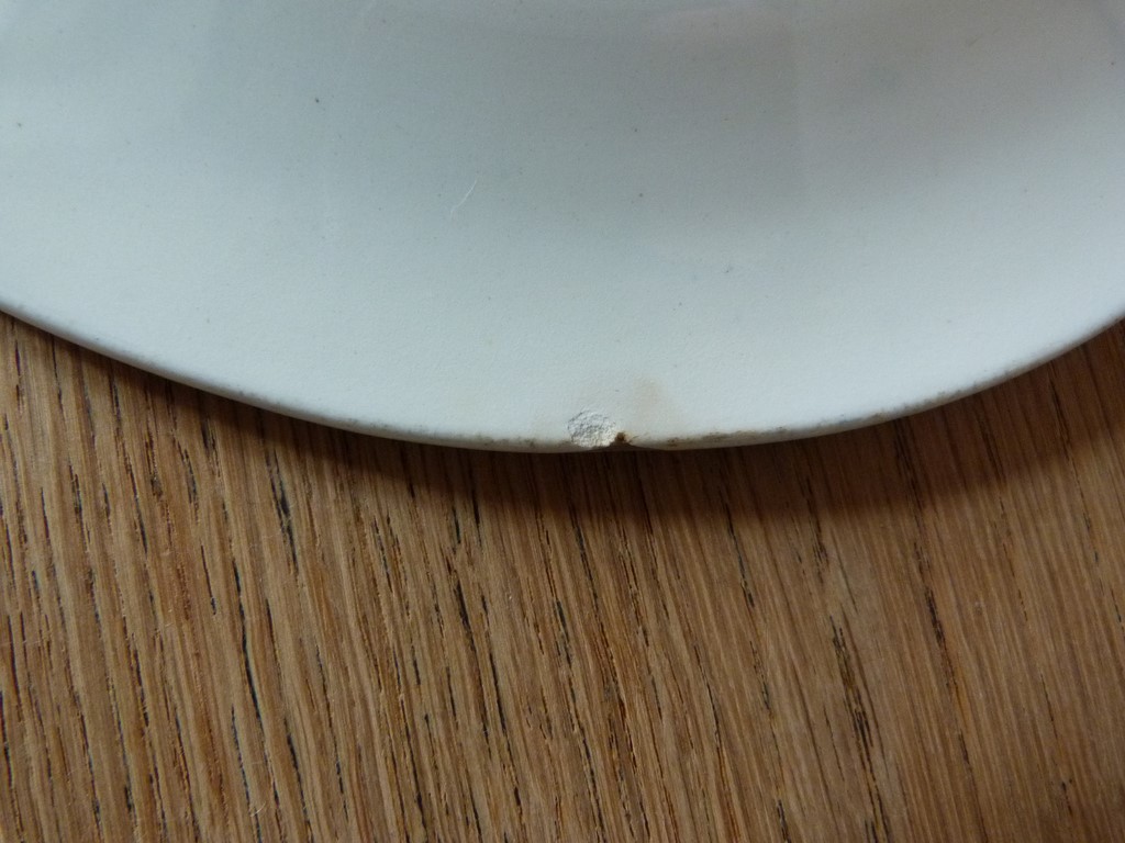 Plat en très bon état et belle brillance malgré 2 petits défauts mineurs à chaque extrémité : un tout petit éclat sur la bordure (petit et discret, voir les photos), un léger cheveu dans la glaçure (ce n'est pas une fêle) rien de grave en tout cas.