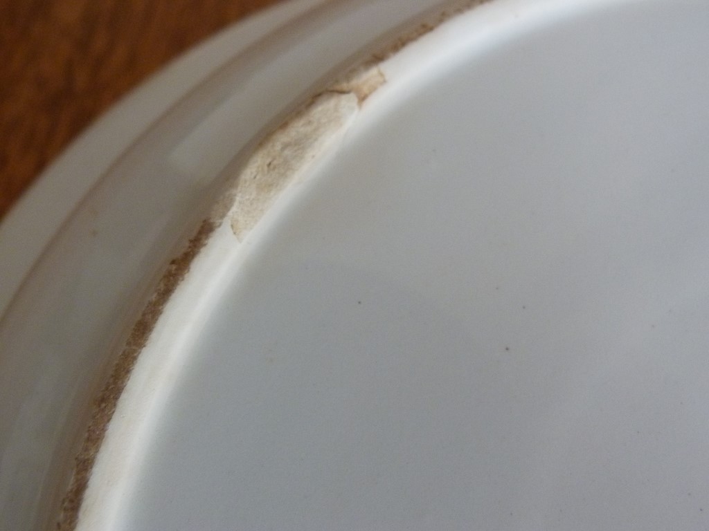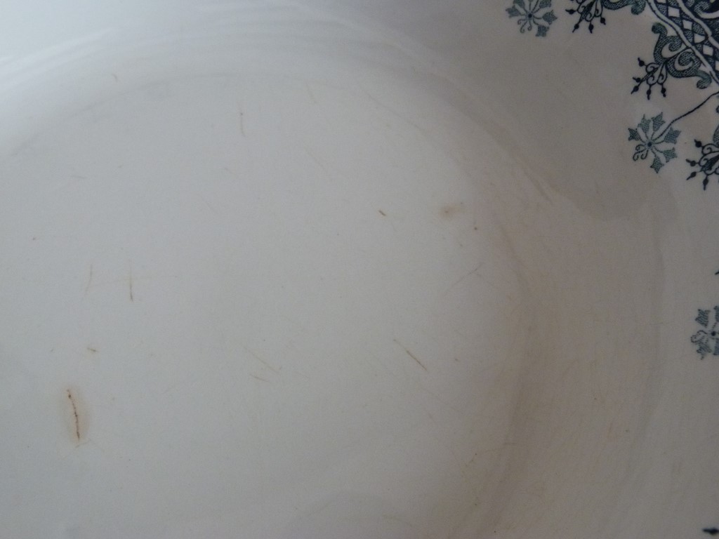 Bon état et brillant, quelques défauts d'usage (vu l'age) : des petites rayures sur le fond (dont certaines plus sombres), un manque de céramique sur le fond à l'arrière, et un léger faïençage visible sur l'arrière (donne l'impression d'un craquelé marqué de jaune), des micro impactes et traces de frottement sur la bordure (rien de grave, très petits, je détail au maximum mes photos), voir les nombreux gros plans.