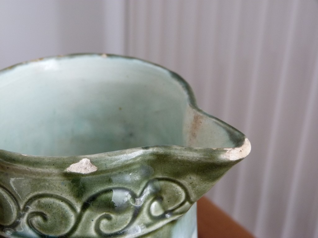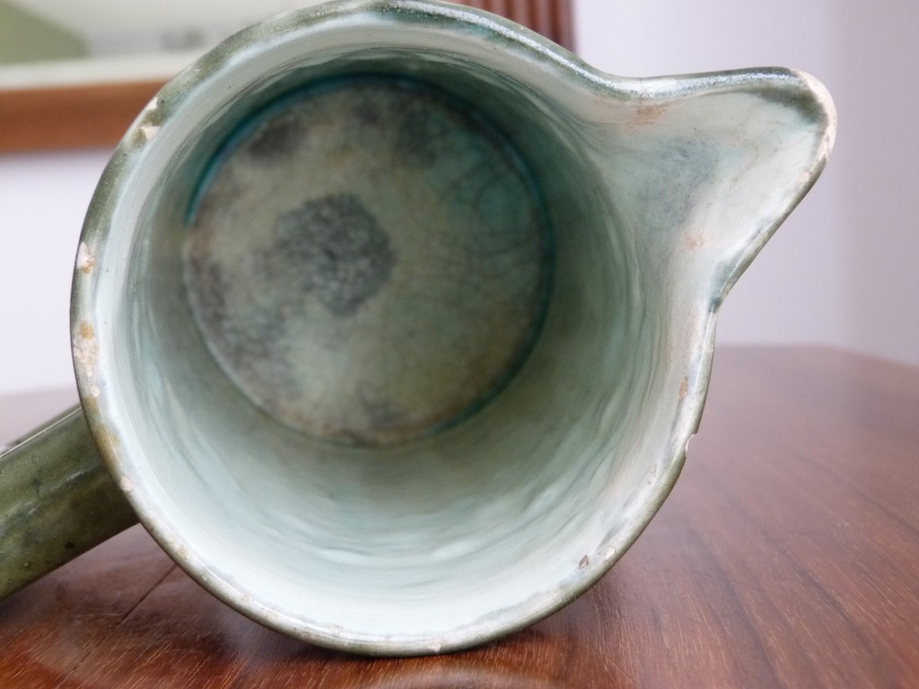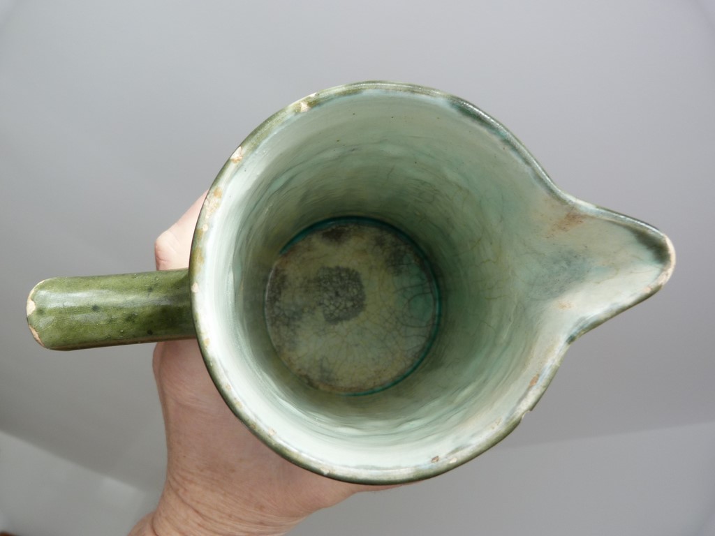 En bon état et belle brillance malgré des petits défauts visibles : des tâches et un léger faïençage à l'intérieur du pichet, des manques de céramique sur la bordure du bec verseur et le pourtour, une usure ou trace de frottement qui à enlevé la céramique sur les arrêtes de l'anse haut et bas (rien de grave pour un pot qui à déjà 100 ans, voir les nombreuses photos de détail). Il n'y a pas de fêle. Il convient d'avantage à mettre en exposition pour une décoration d'intérieur qu'à un usage usuel.