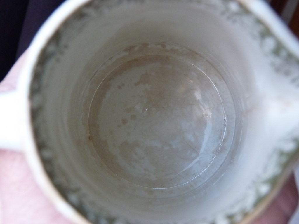 En bon état et belle brillance malgré des petits défauts visibles, des tâches sur le corps, sur le dessous et sur le fond intérieur, sur la bordure du bec verseur, sur l'anse (rien de grave en tout cas, voir les nombreuses photos de détail). Il n'y a pas de fêle et pas d'éclat. Il n'y a pas d'odeur d'humidité.