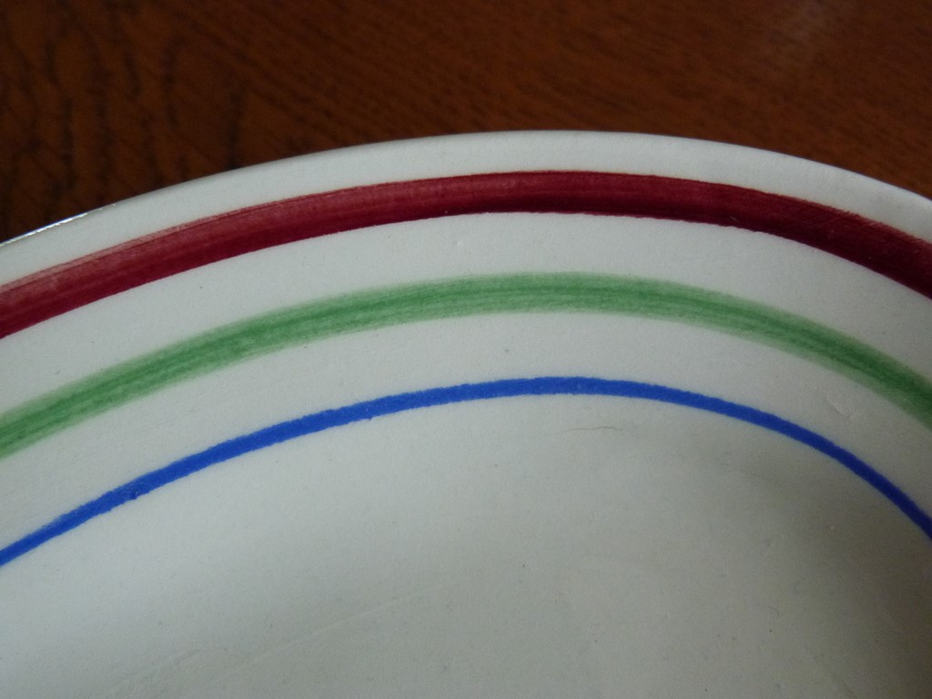 Couleur : du fond blanc-crême, avec une frise représentant des traits de différentes épaisseurs et couleurs (bordeaux, vert, bleu)