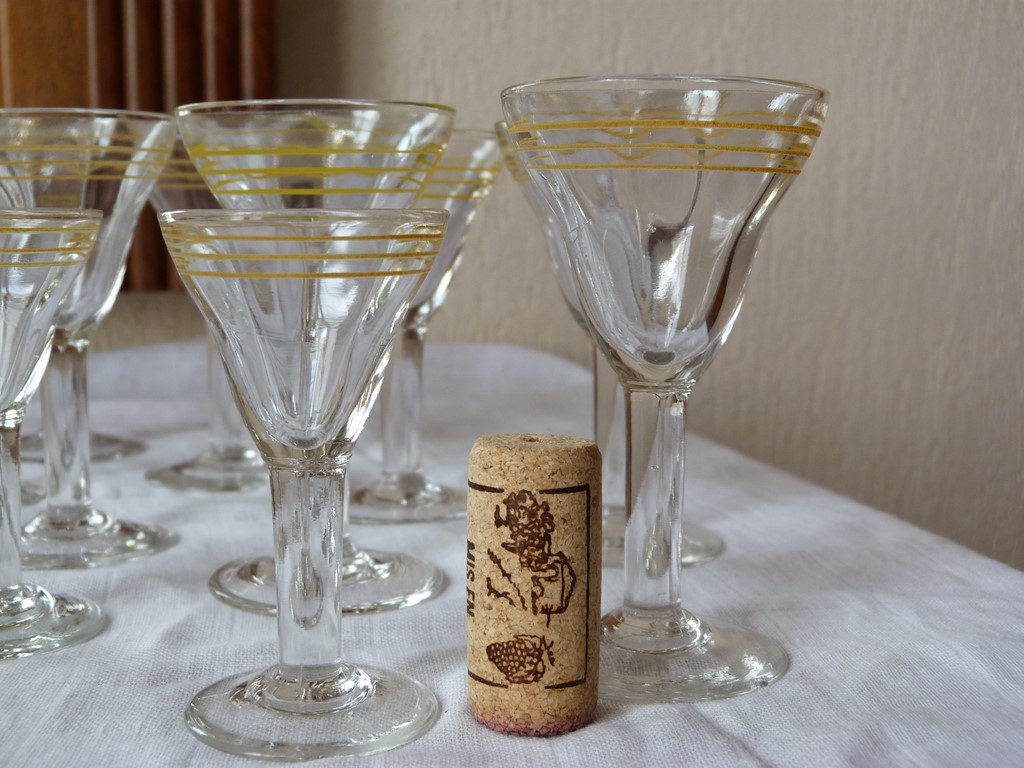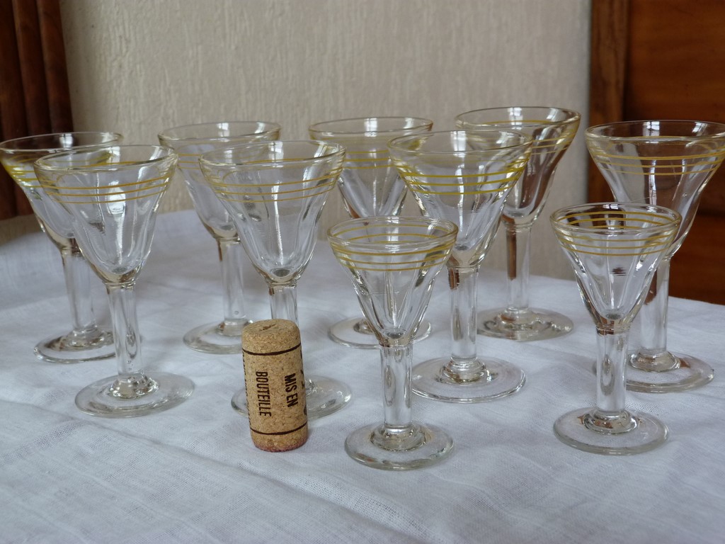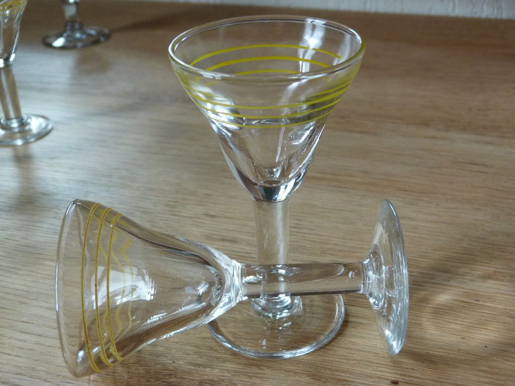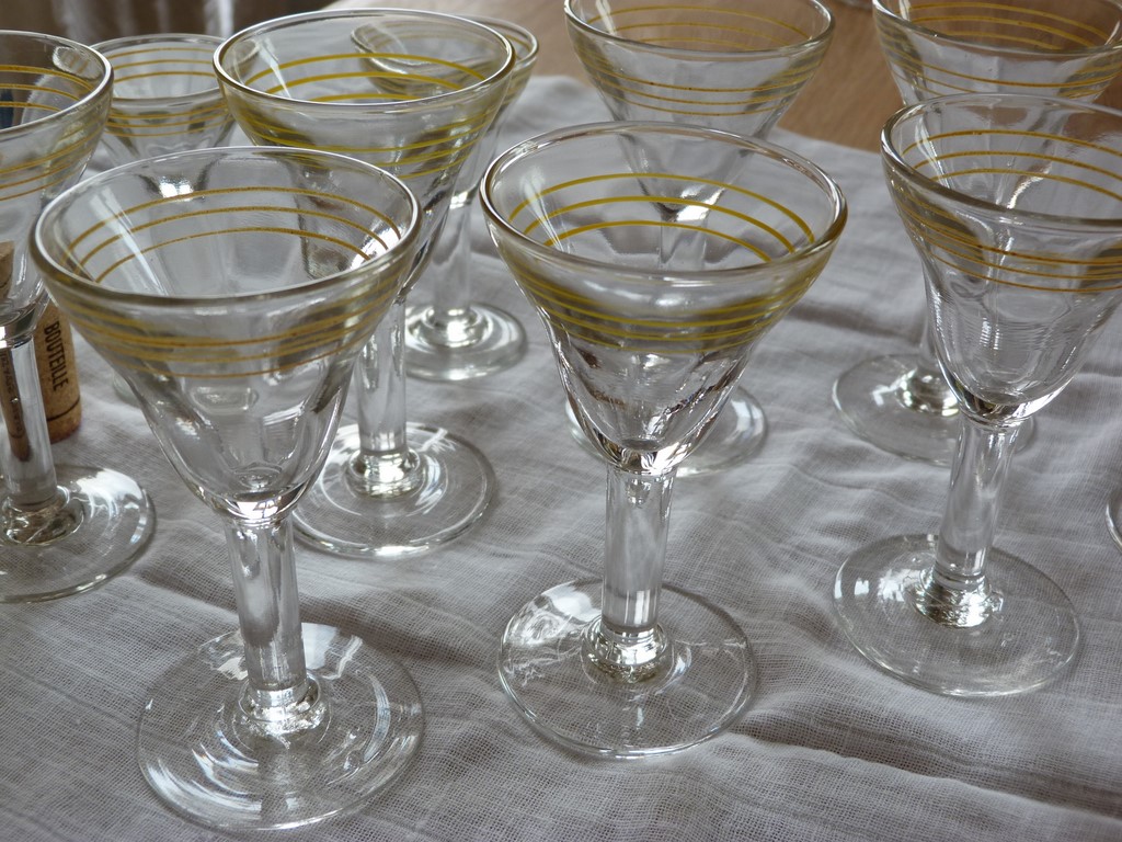 Un joli lot ancien composé : de 8 verres bistrot à vin cuit (apéritif) et de 2 petits verres pour digestif. Décor sympa de 3 traits jaune sur le haut du verre.