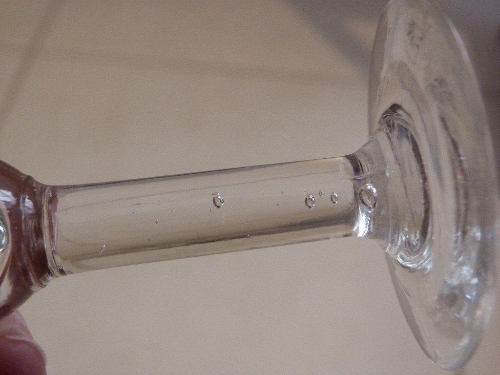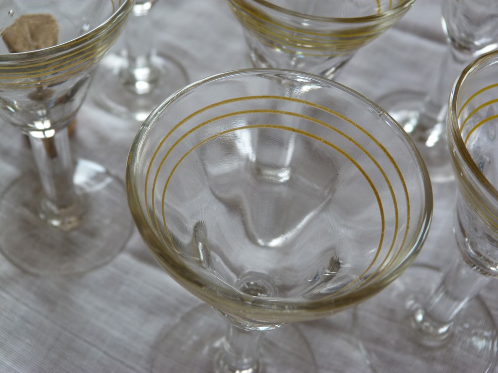 Verres assez épais, brillants, de forme évasée, en très bon état. A signaler sur un pied un petit éclat (voir photo), et la base d'un autre pied est légèrement bombée (déformation à la cuisson lors de la fabrication, ce qui lui donne une léger effet de bascule) . Parfois de jolies petites bulles d'air (voir photos), des micro marques de frottement, trait dans le verre, fil d'étirement lors de la fabrication, ces irrégularités attestent de l'ancienneté de ces verres.