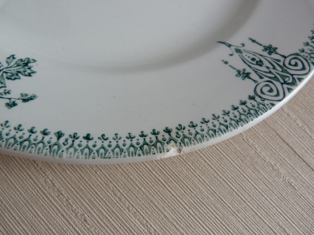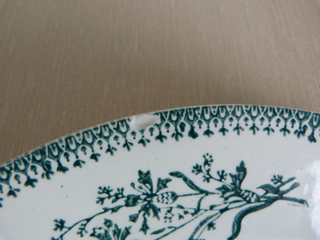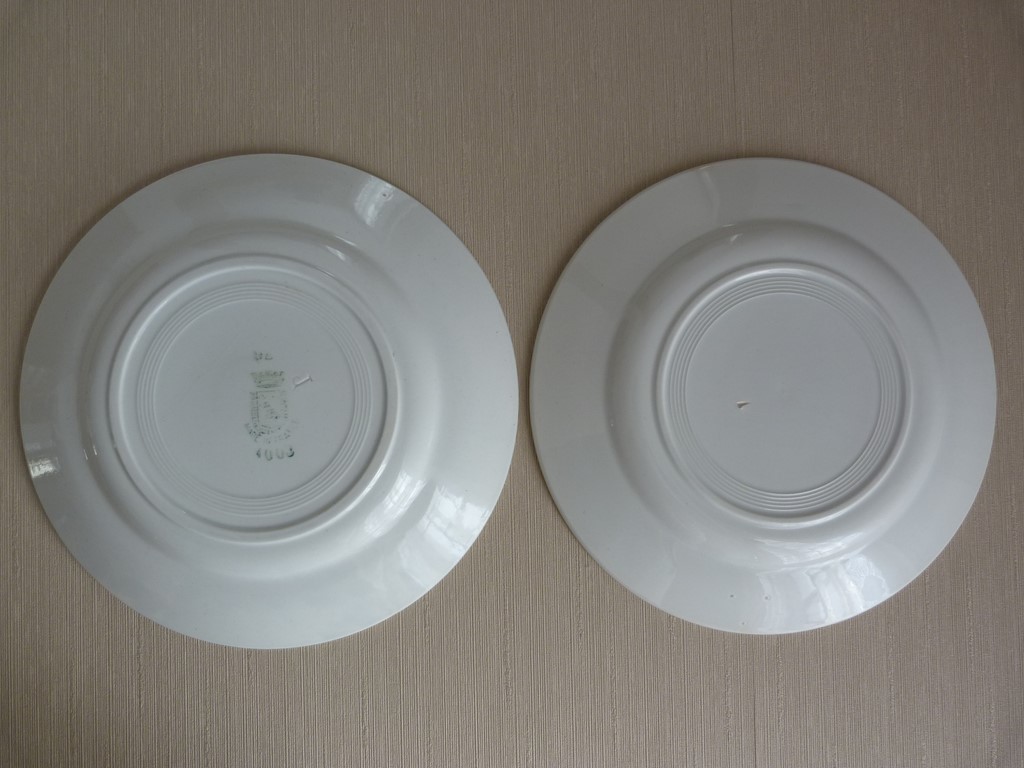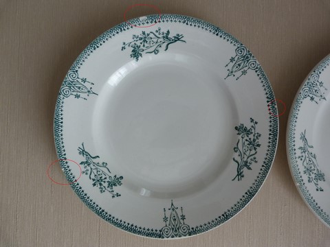 Très bon état et belle brillance pour cette vaisselle ancienne, malgré certaines marques du temps notifiées sur les photos par un cercle rouge (petits manques de céramique sur la bordure des assiettes (3 pour l'une et 2 pour l'autre). Malgré ces petits défauts, je dirai que ces assiettes restent de qualité, car elles sont bien blanches, pas de fêle, peu utilisées.