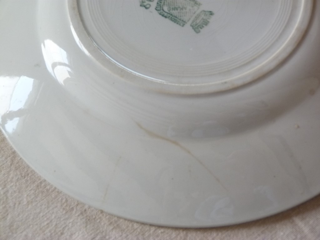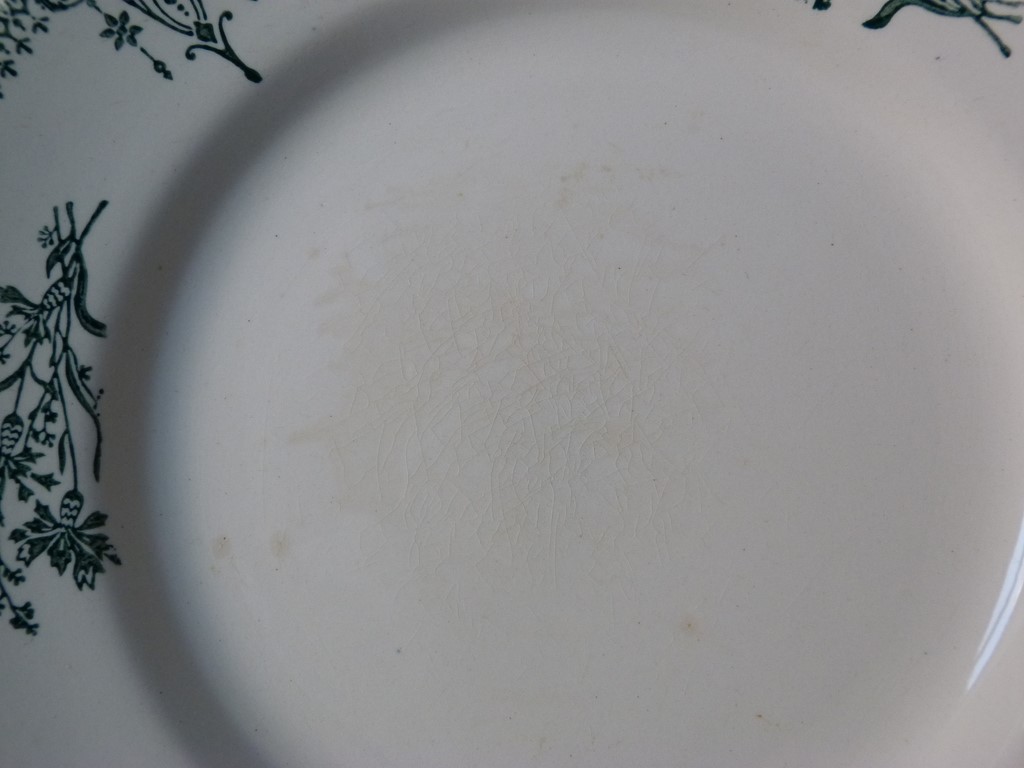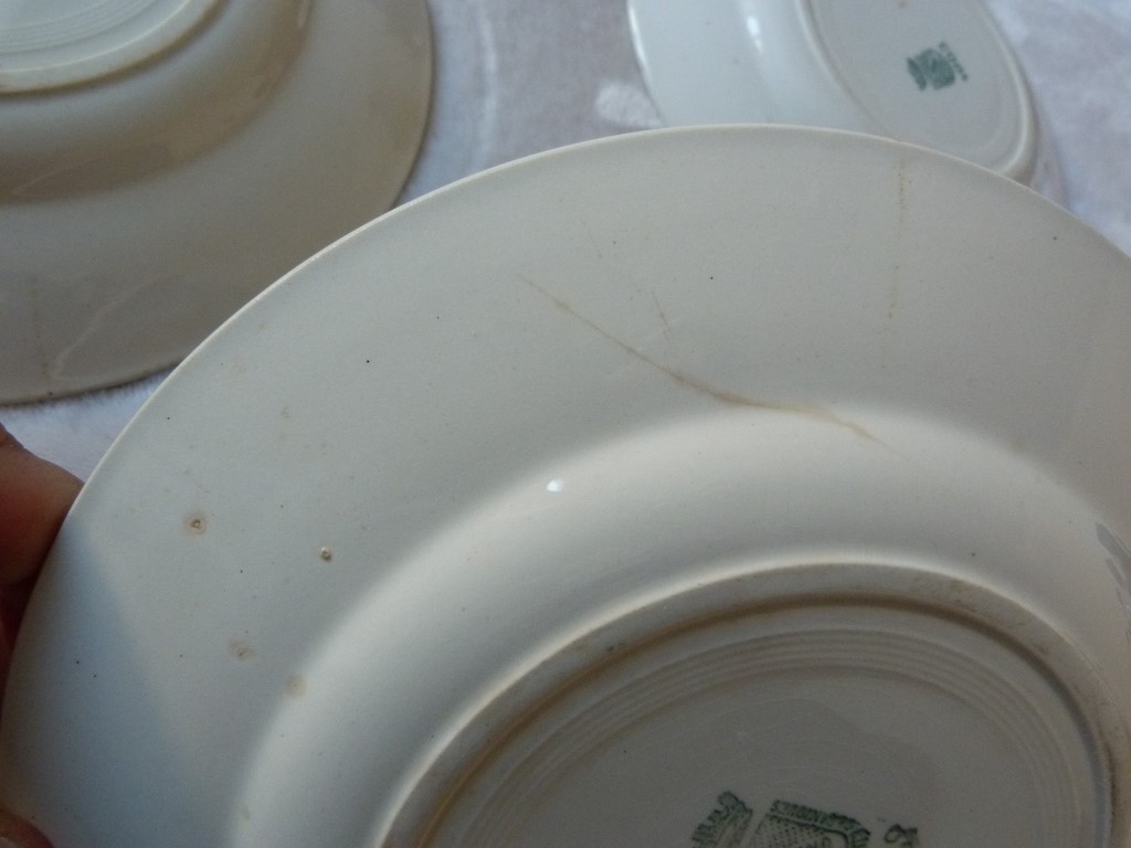 Bon état et belle brillance pour cette vaisselle ancienne, à noter des petits défauts d'usage, mais rien de grave (voir photos) : petits impacts en bordure, deux ont une petite tache sur le fond, une autre à une petite fèle (visible devant et derrière), quelques unes le verni donne un effet craquelé.