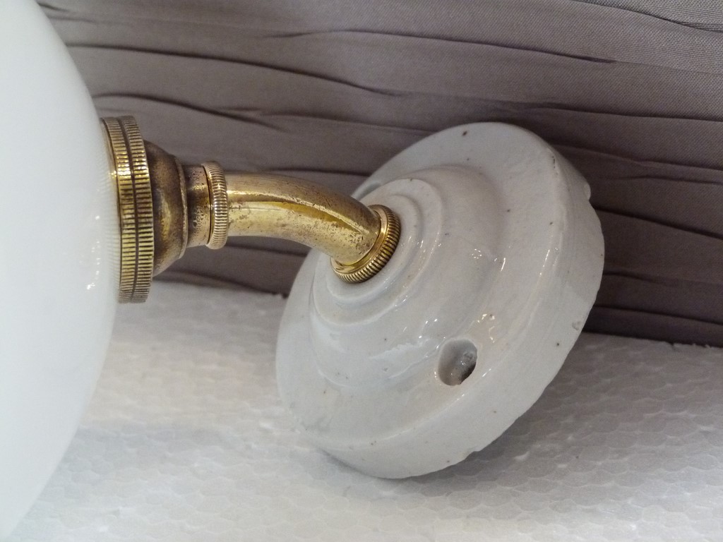 Applique ancienne base courte porcelaine laiton et tulipe boule blanche