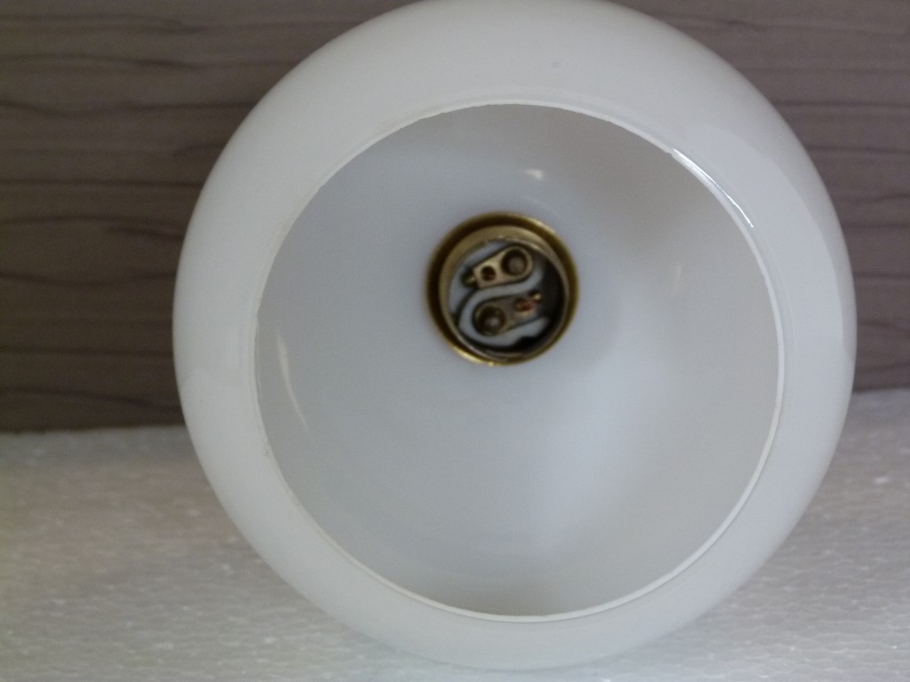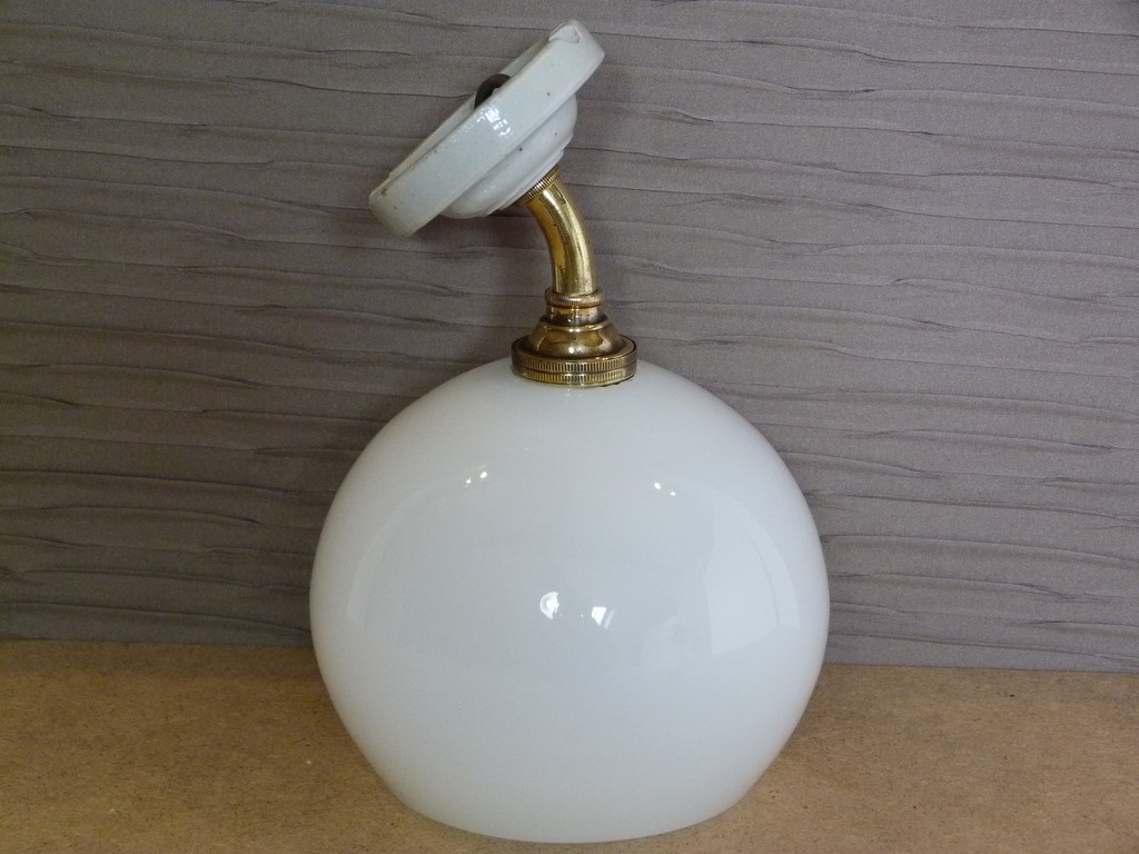 La tulipe en opaline blanche est en forme de boule, à noter des micro égrenures en bordure de la collerette et au niveau du trou de la douille (rien de grave, voir les photos de gros plans).