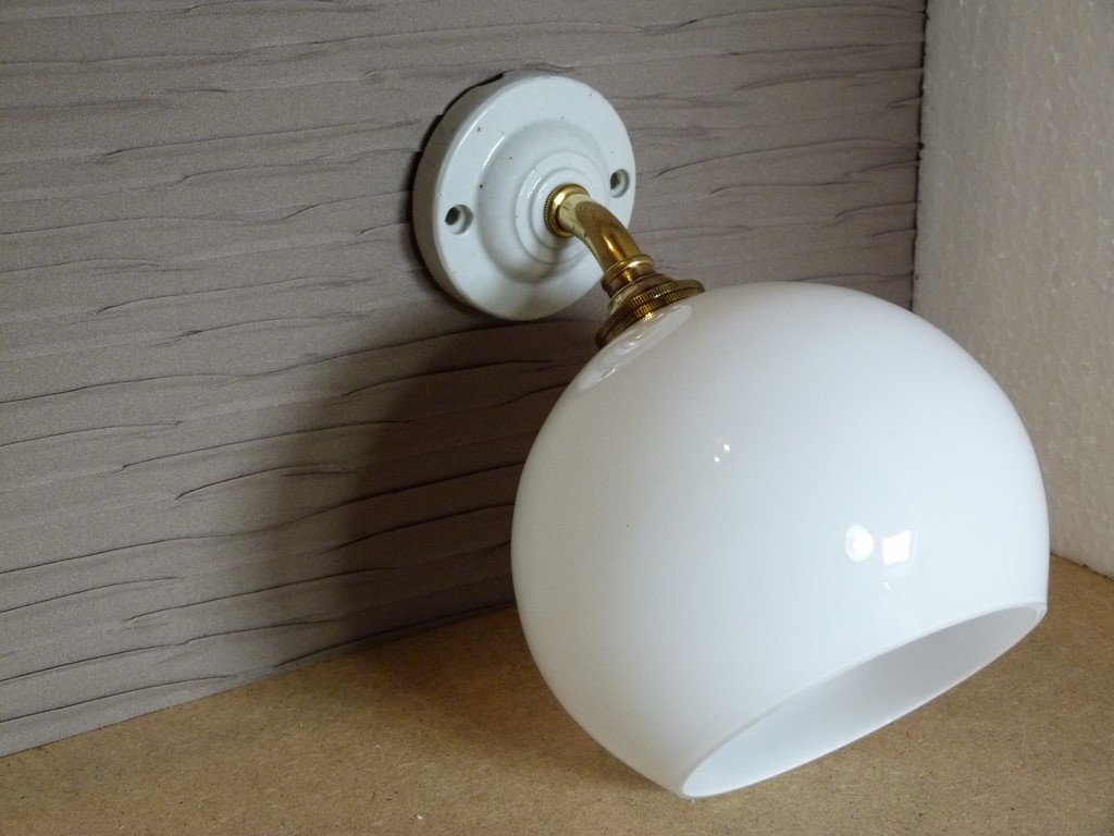 Ancienne applique courte, petit col de cygne en laiton et base porcelaine, avec une tulipe forme boule en verre opalin blanc.