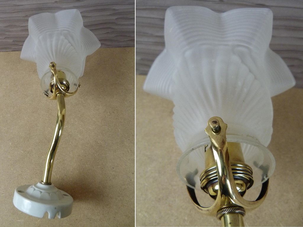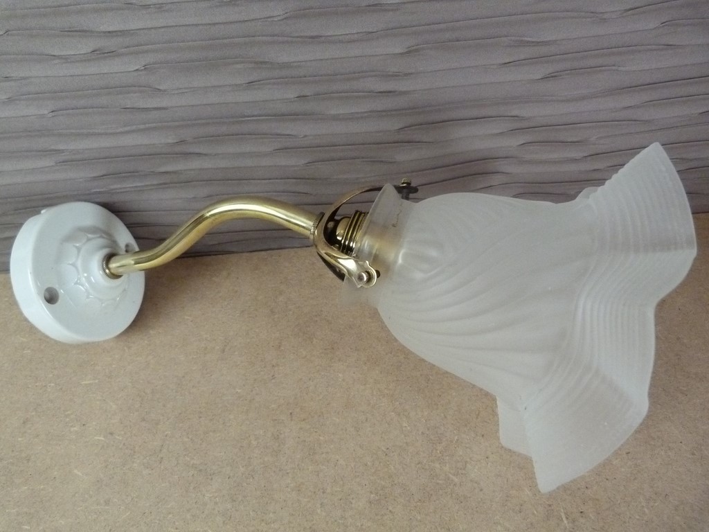 Applique ancienne col de cygne en laiton et base porcelaine, avec une tulipe opaque avec motif de plissages croisés (système à griffe).