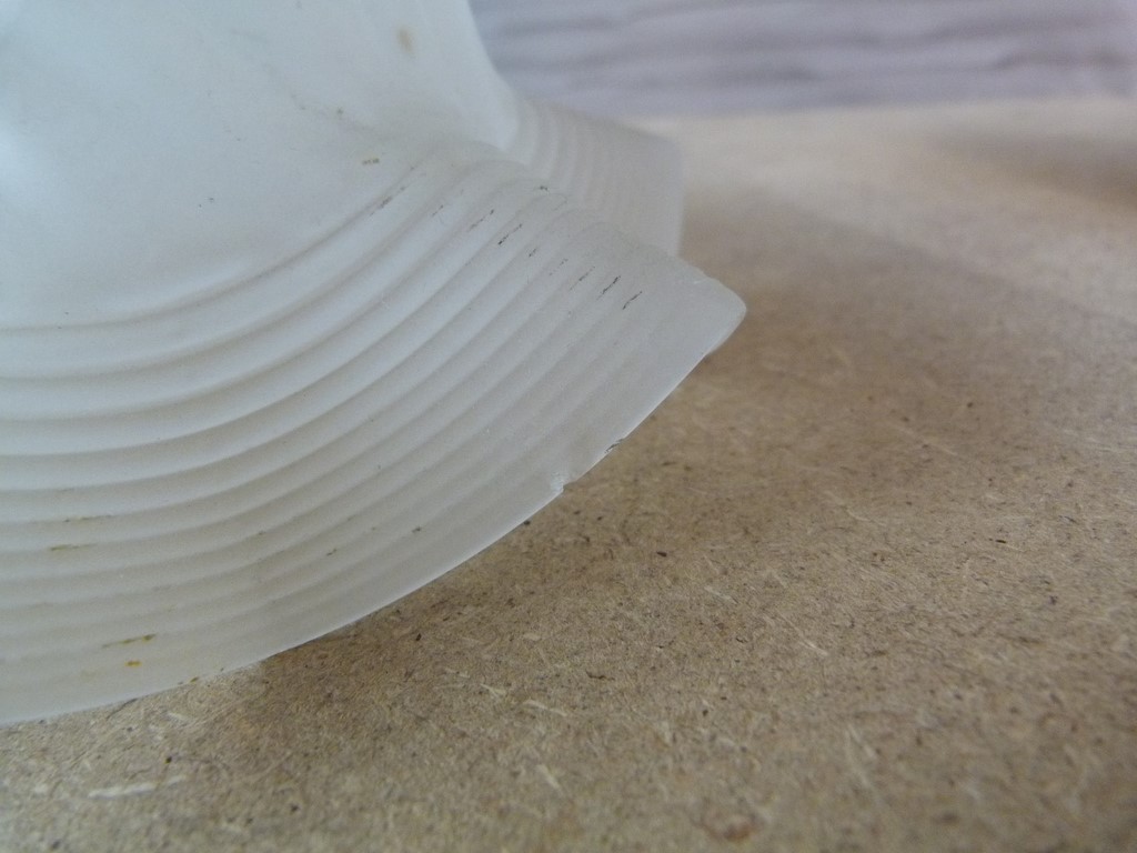 La tulipe est en verre opaque givré, à noter des petites égrenures et micro éclats en bordure de la collerette et sur le bord juponné en bas (rien de grave, voir les photos de gros plans).