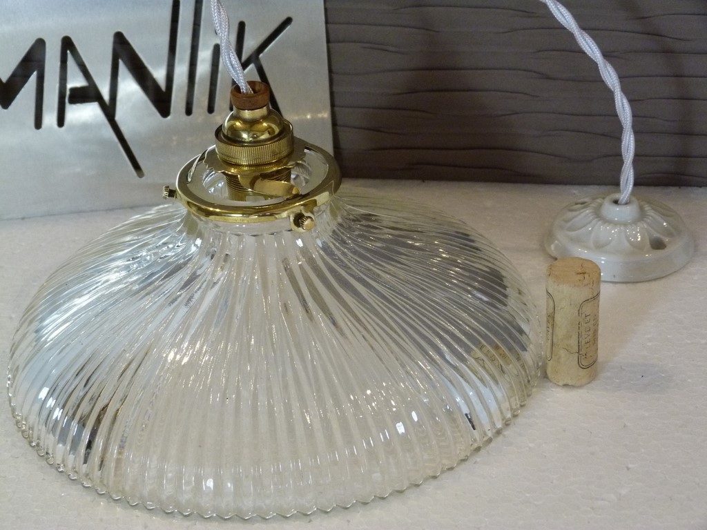 avec son abat jour en verre transparent et à facette de style Holophane (le verre porte un numéro et est signé mais je n'arrive pas à lire le nom de fabrique)