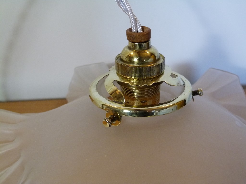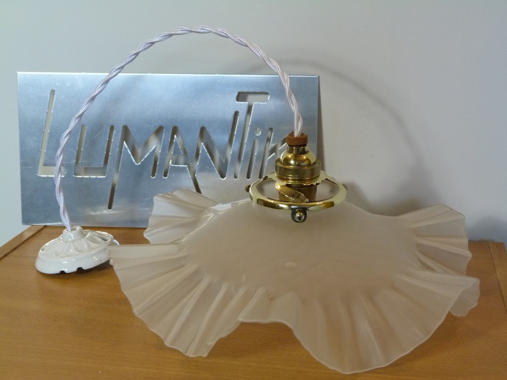 L' abat jour est en verre opaque (givré), avec de légers motifs à losanges style arlequin, à signaler quelques petits éclats sur la collerette (ne se verront pas, car cachés par la griffe - voir les photos), ainsi qu'une bulle d'air (lors de la fabrication, qui prouve son ancienneté).