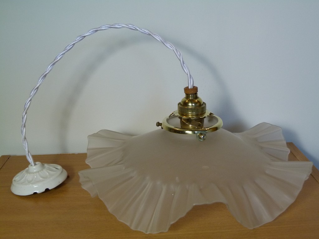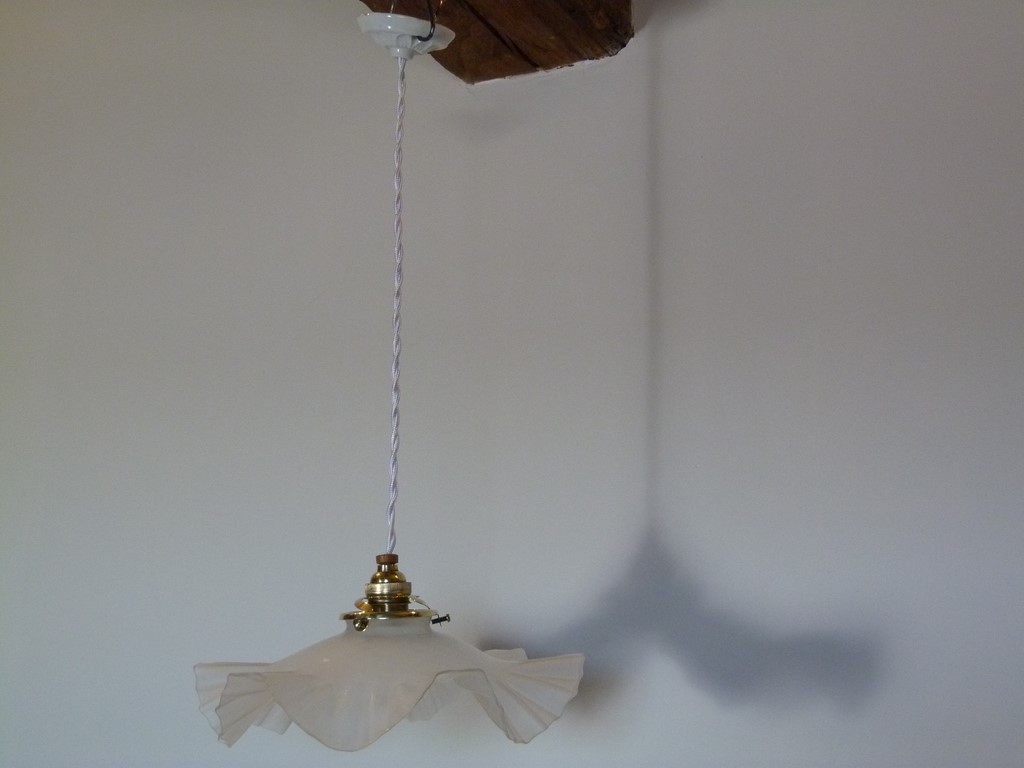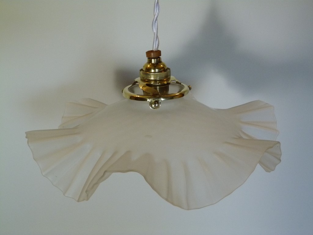 suspension ancienne abat jour verre opaque juponné en bordure