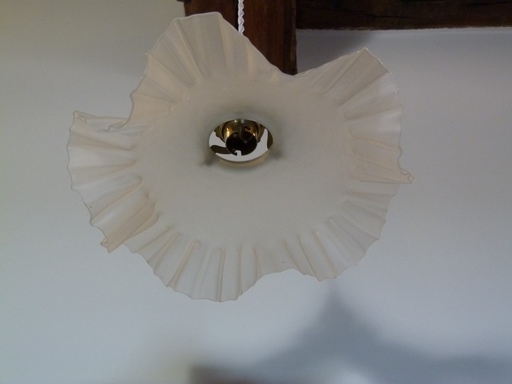 avec son abat jour en verre opaque plissé, juponné sur la bordure du bas