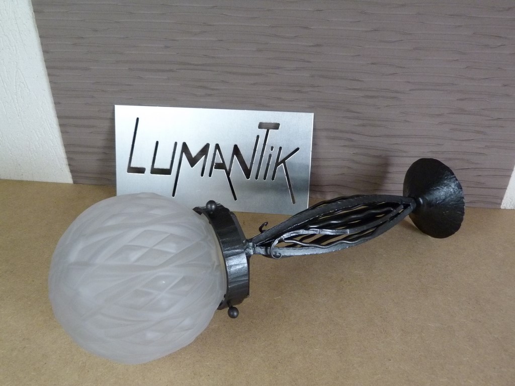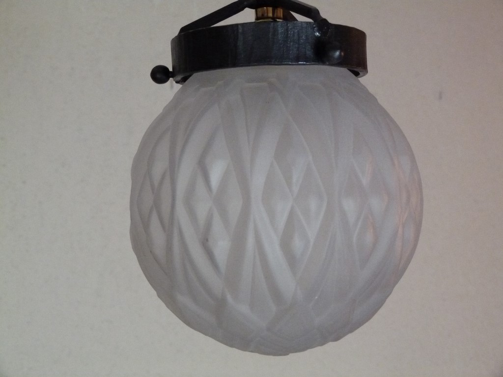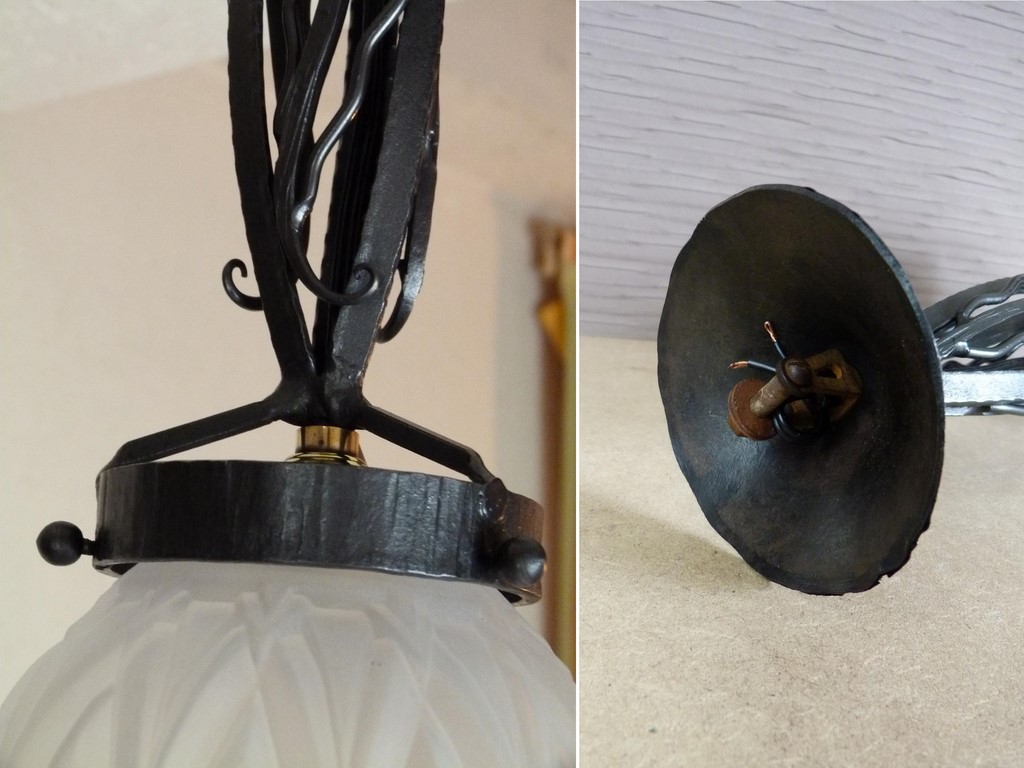 Suspension ancienne en fer forgé & globe motif géométrique ART DECO FOURNET?