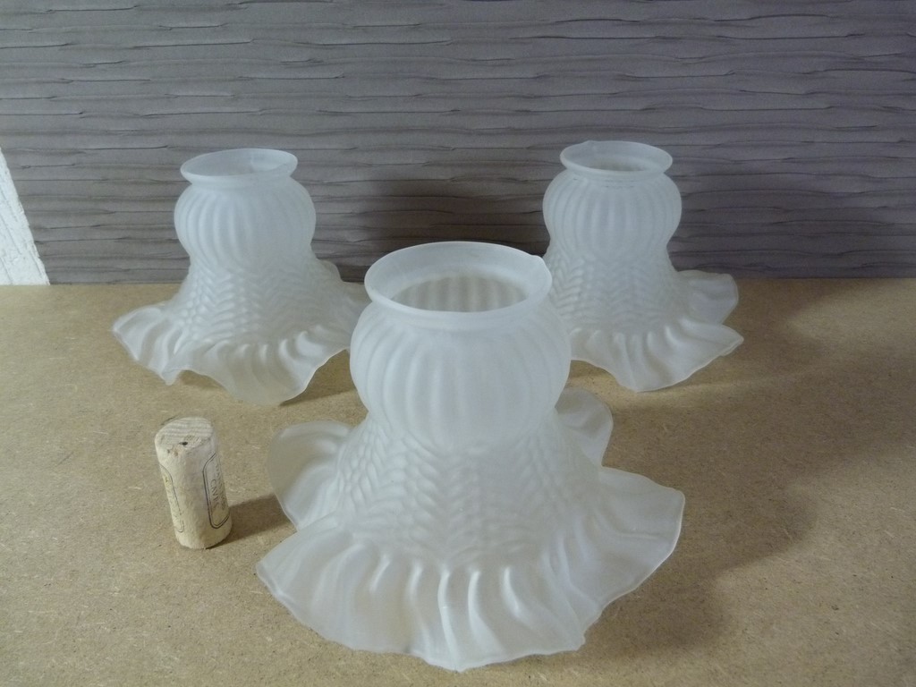 Lot de 3 tulipes en verre moulé opaque, plissées et juponnées sur la bordure du bas. Motifs en relief représentant des épis de blé, système de fixation par griffe. Pour restauration lustre, appliques.