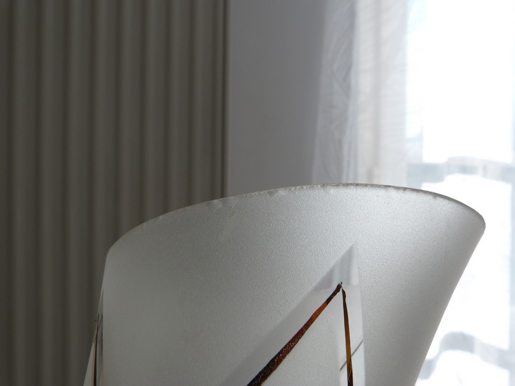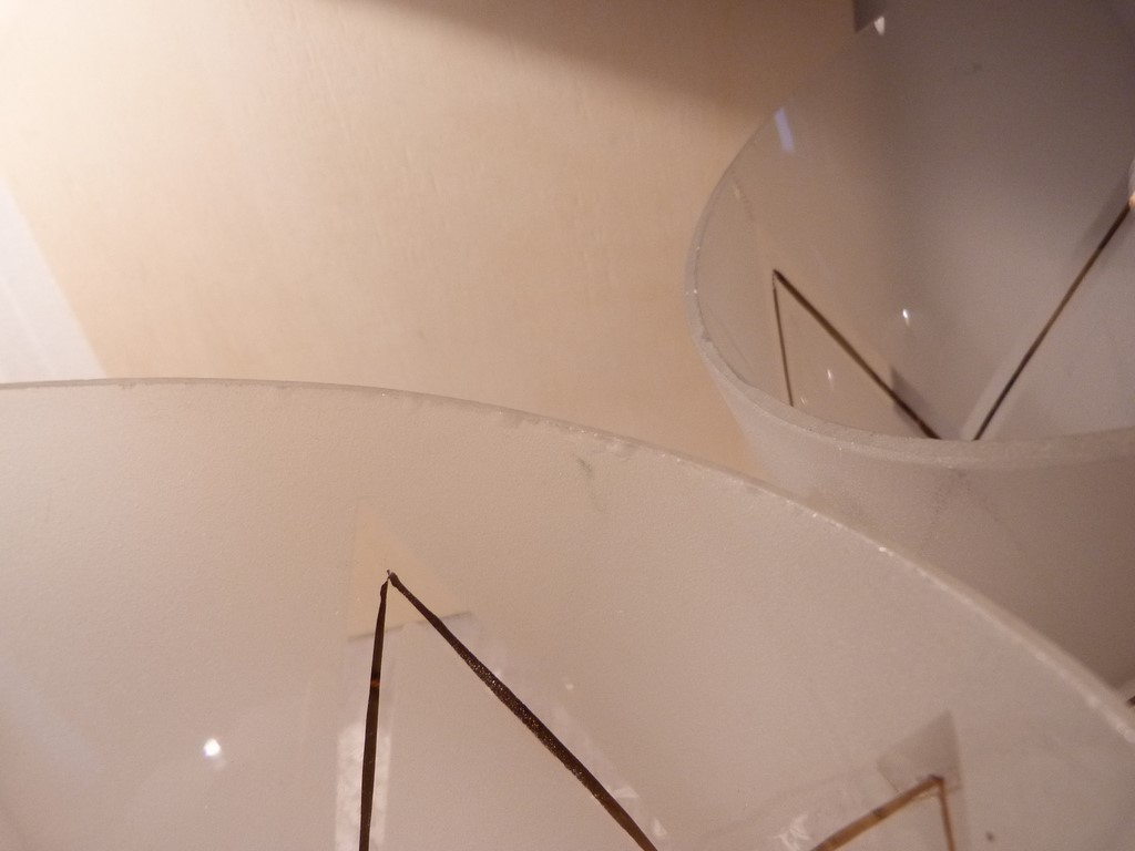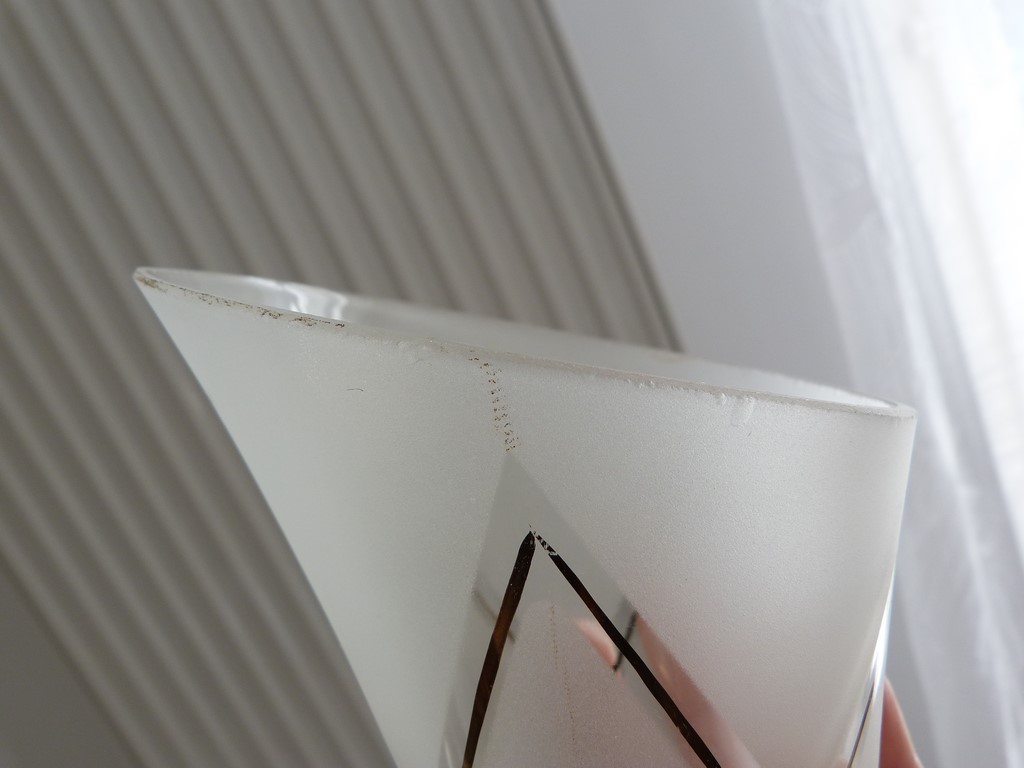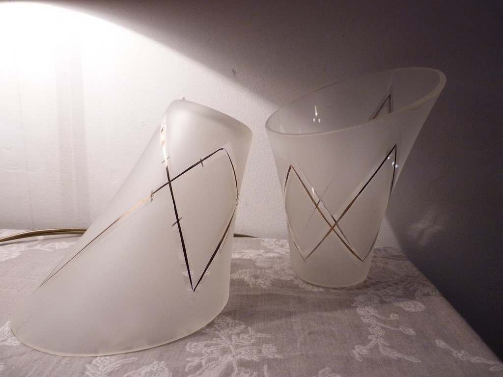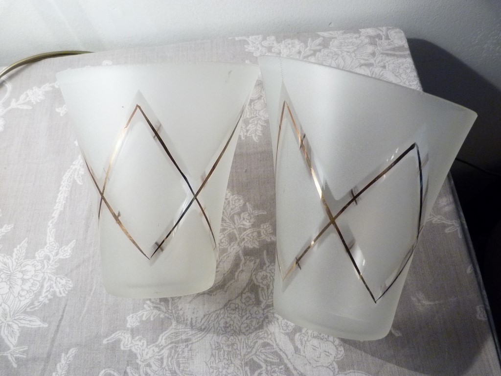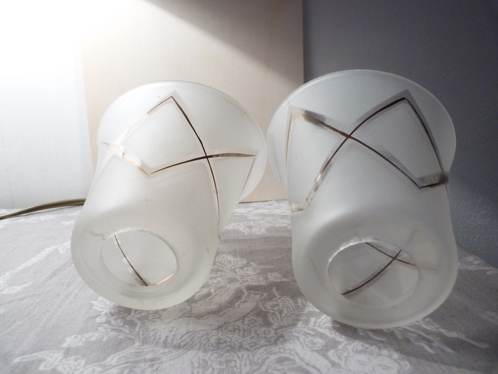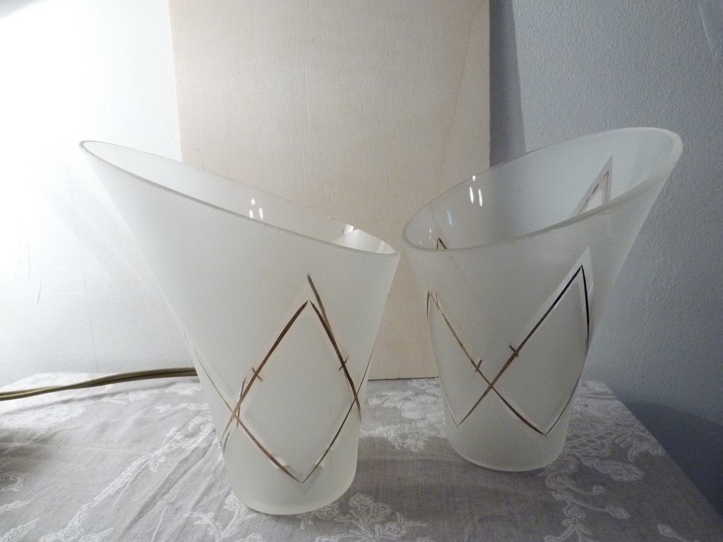 Un lot composé de 2 tulipes en verre dépoli (opaque) et filets or entrecroisés dans la partie poli (transparente) du verre. Forme tronquée-ou biseautée. Pour lustre des années 50-60 (peut-être dans le goût de Lunel Arlus ??)