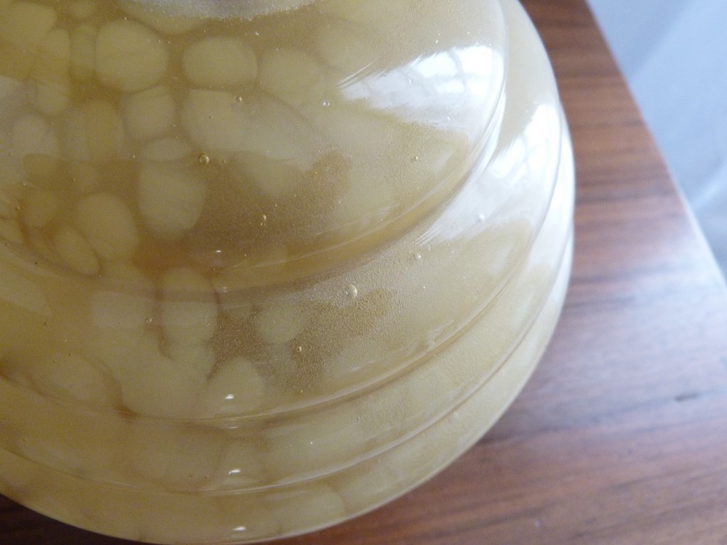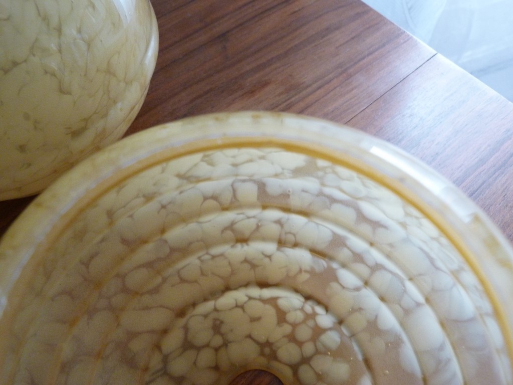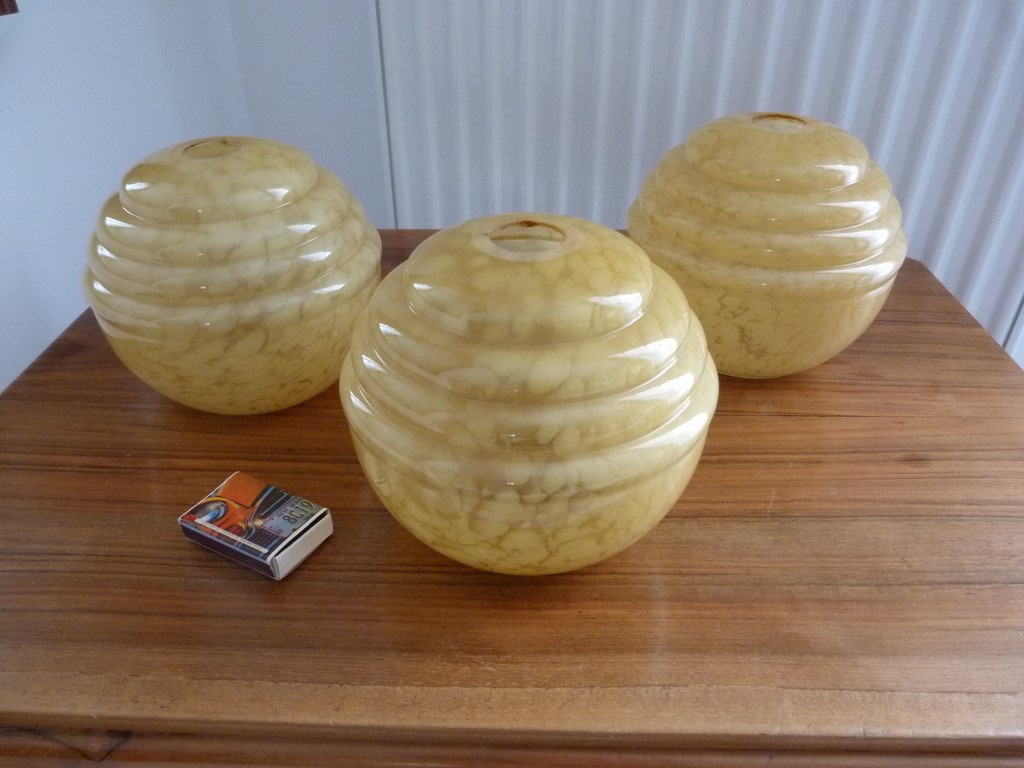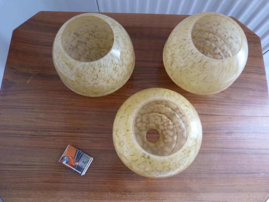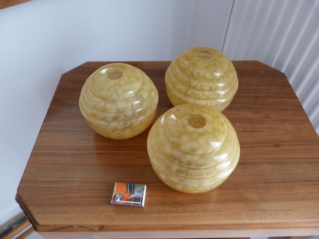Je possède en tout 5 globes, mais vendus dans 2 annonces différentes : un lot de 2 et un lot de 3. A signaler une très légère différence de teinte caramel entre les 2 lots (le lot de 2 globes est un peu plus foncé que celui de 3 globes (voir dernière photo, vu d'ensemble)).