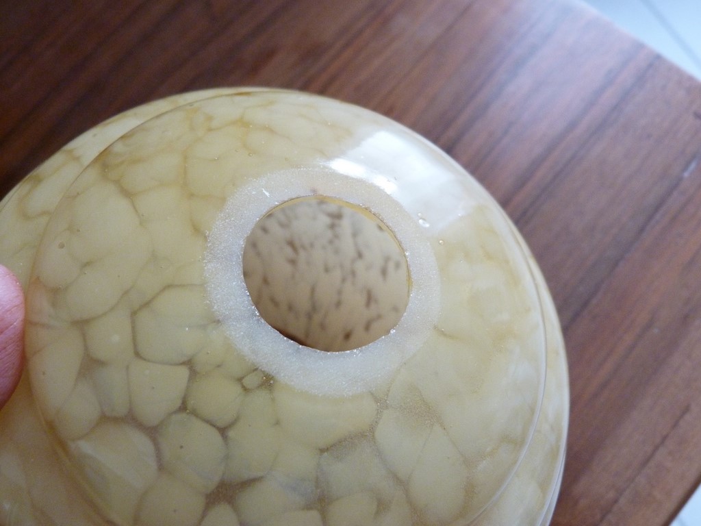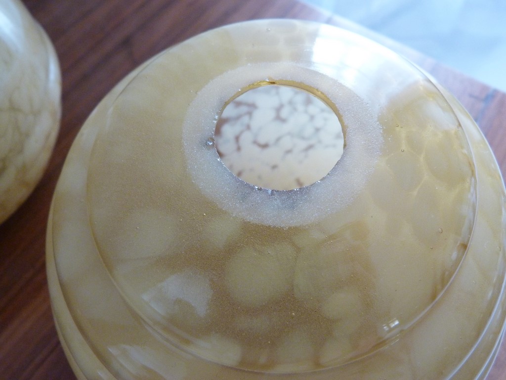 Très bon état de l'ensemble, ces globes sont un peu plus grands que le modèle courant connu, du plus bel effet une fois allumés, cela laisse apparaître des petites bulles d'air emprisonnées dans le verre (preuve de l'ancienneté).