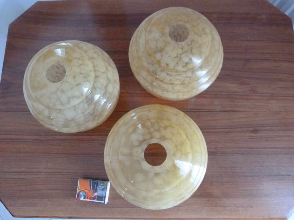 Un lot composé de 3 globes en verre moucheté (verrerie de clichy), de forme annelée, et d'une jolie couleur caramel.